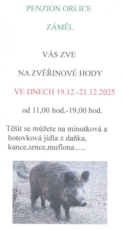 Zvěřinové hody v penzionu Orlice 19.12. - 21.12.2025 od 10:00 - 19:00 hod.