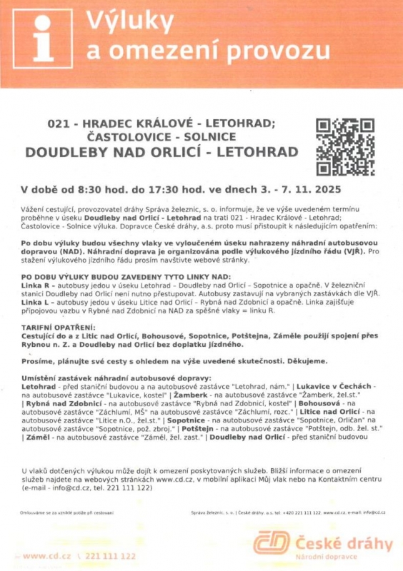 Výlukovy jízdní řád ČD v době 8:30 - 17:30 ve dnech 3. - 7. 11.2025